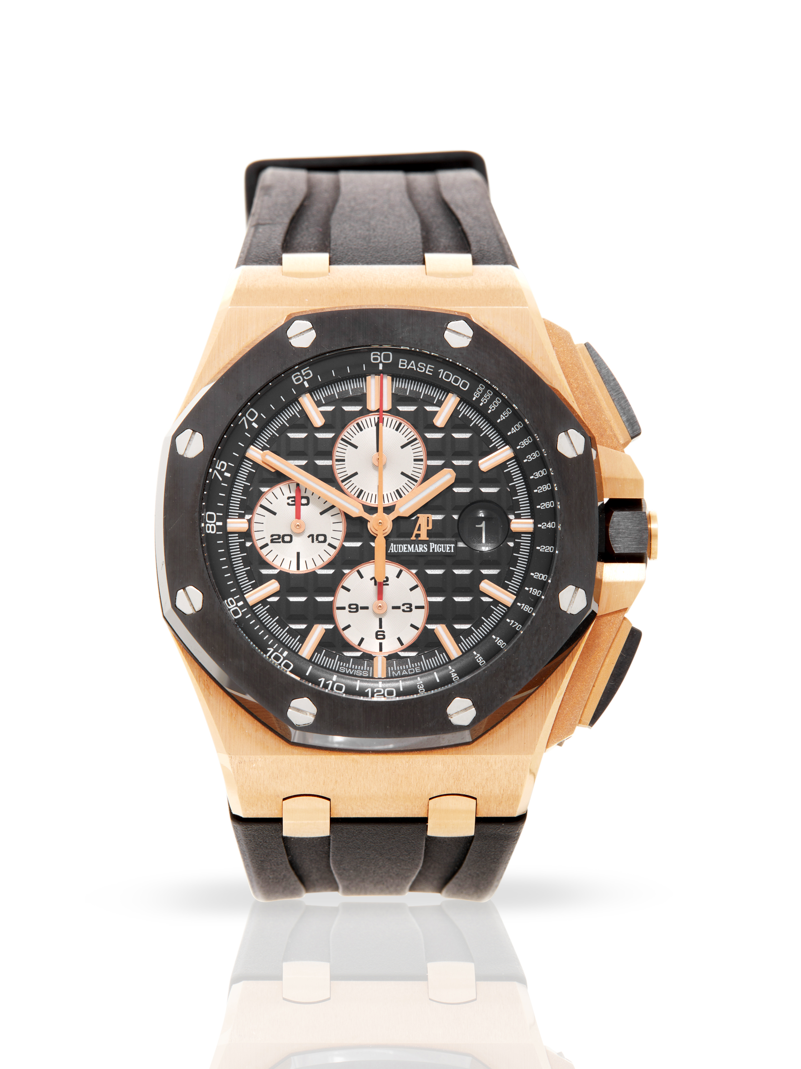 This Audemars Piguet Royal Oak Offshore 26401RO.OO.A002CA.01 has a black baton dial and a rubber strap. This Audemars Piguet has undergone a thorough inspection of accuracy, functionality and condition at our Audemars Piguet certified service centre to determine the level of reconditioning required to meet our strict standards. It has also been checked against our records to ensure authenticity. All our watches have a 24-month warranty for your peace of mind.