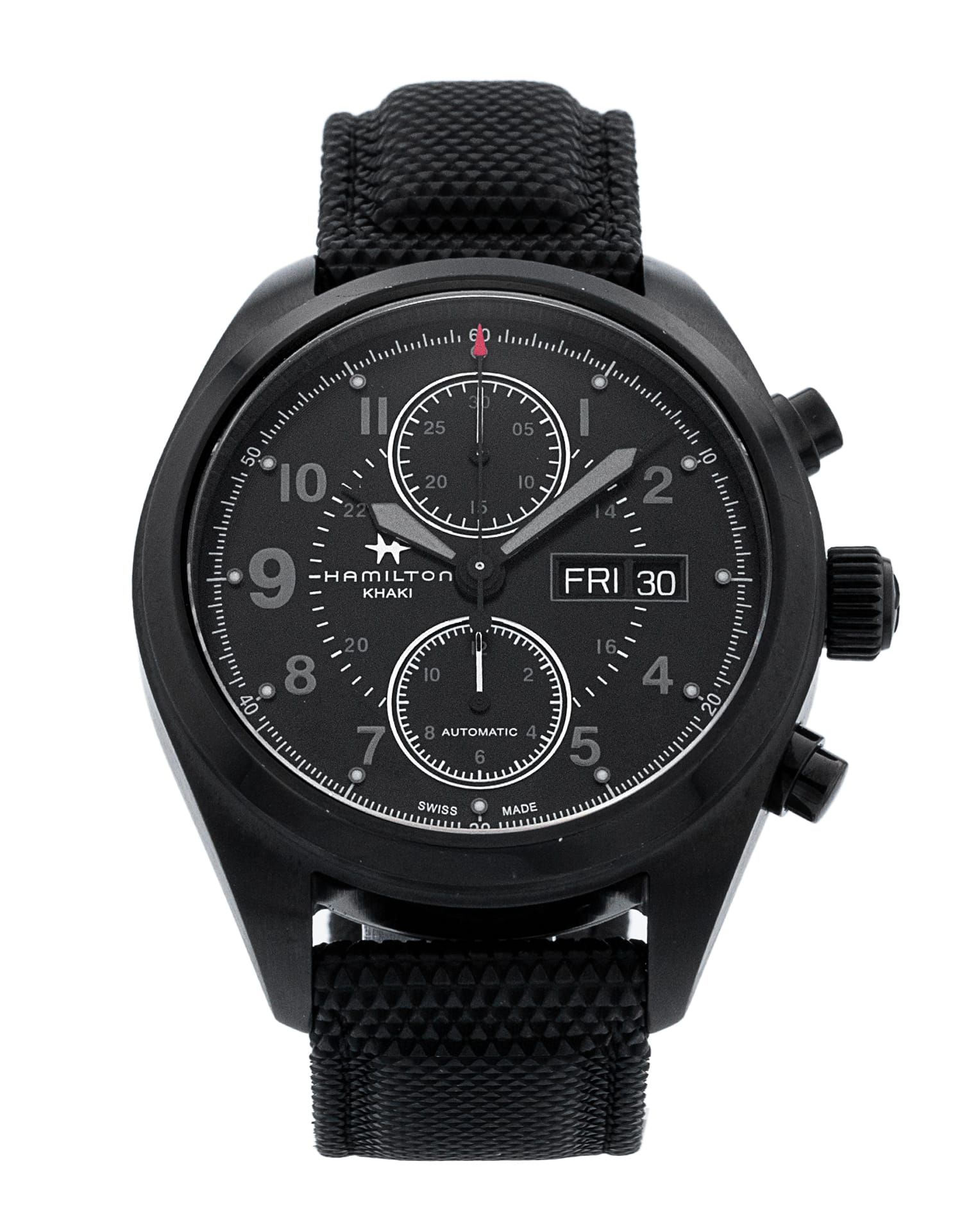This Hamilton Khaki Field H71626735 has a black arabic dial and a rubber strap. This Hamilton has undergone a thorough inspection of water resistance, accuracy, functionality and condition to determine the level of reconditioning required to meet our strict standards. It has also been referenced against technical documents and manufacturer records where available to ensure authenticity and a clean history. All our watches have a 24-month warranty for your peace of mind.